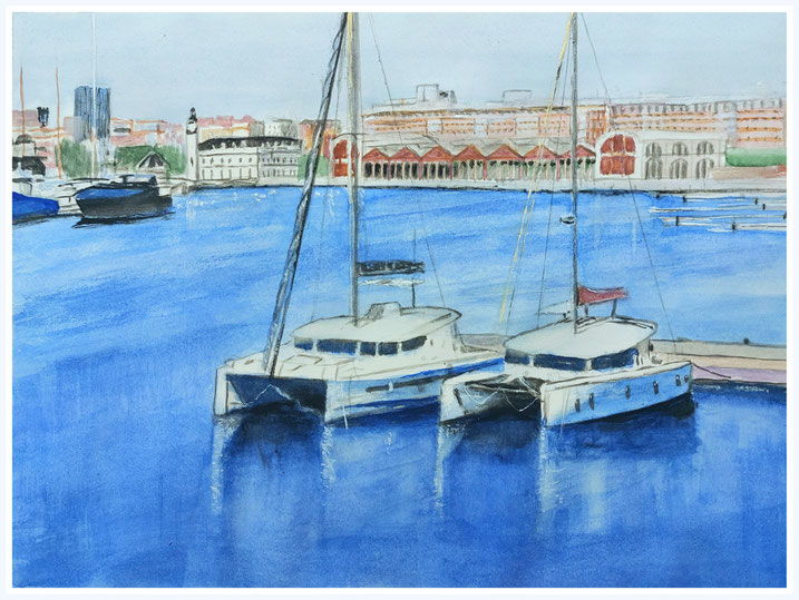 Catamaranes de recreo en le puerto de Valencia, con imágenes del antiguo puerto, como el edificio del reloj y los tinglados del puerto.