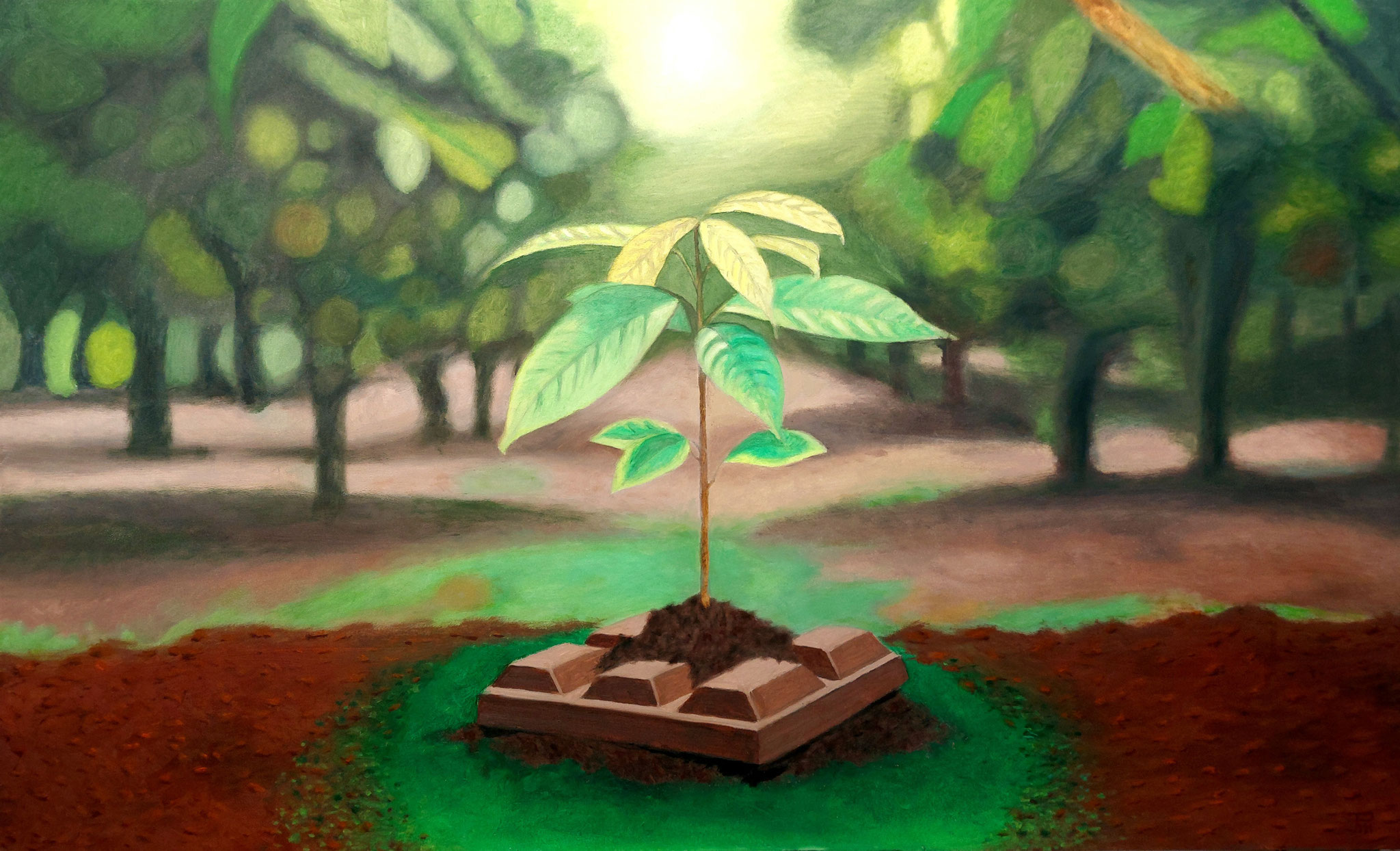 El cuadro presenta una escena onírica y simbólica, donde el foco central es un brote de árbol que emerge directamente de una tableta de chocolate. Este elemento fusiona la naturaleza y el producto procesado, creando una metáfora visual sobre el origen y la transformación. El brote, contrastando con la tableta, sugiere un renacimiento o una conexión esencial con los orígenes naturales del cacao.