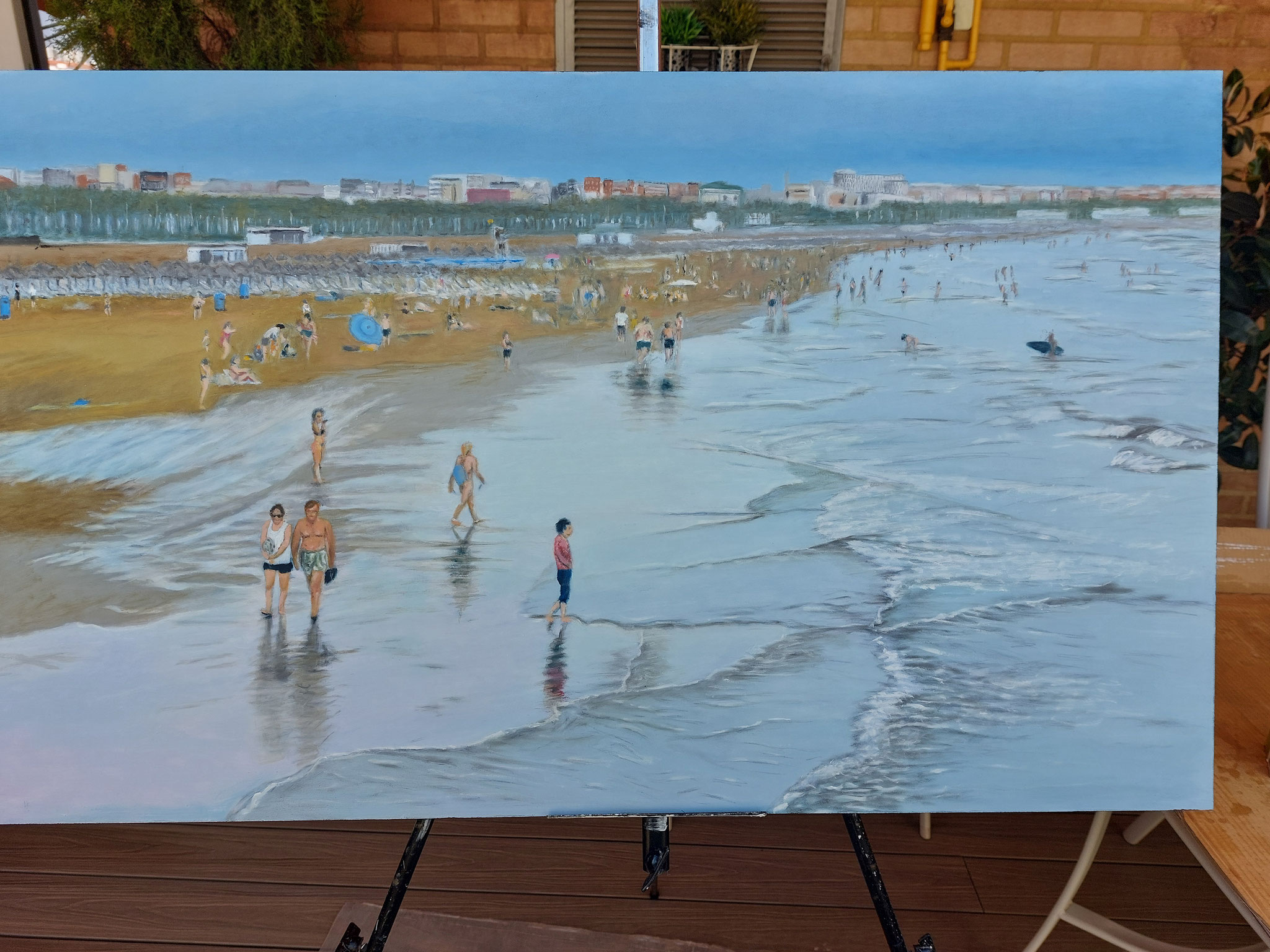 Vista desde la escollera en la playa de la Malvarrosa de Valencia, un dia de verano nuboso y con pocas invitaciones al baño.
